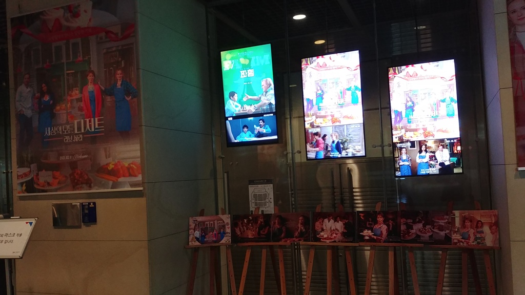한 켠에는 '세상의 모든 디저트:러브사라' 홍보를 위해 예고편 영상을 반복재생하고 아래에는 이젤에 영화속 한 장면의 사진을 전시회처럼 전시해 놓았다.