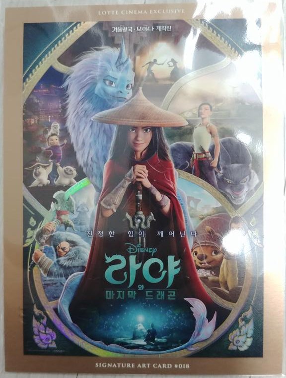 일단 보고 있자니 상당히 잘 만든 영화인듯 햇다. 내가 볼 때는 비슷한 동양계 영화로 뮬란이라는 영화가 있는데 이것보다 훨씬 더 좋은 것 같다. 그런데 여기에 나오는 용이 약간 뭔가 유니콘 같은 모양인 듯 한 느낌으로 상당히 멋있는 용이 나올 줄 알았는데 약간 실망감이 들기도 했다. 내가 상상하던 용은 멋지고 웅장한 느낌의 용이어야 하는데 그 생각을 바꿔버렸다. 등장인물은 라야, 시수, 벤자 족장, 나마리 등 여러 목소리가 나오는데 더빙으로 인하여 다른 사람의 목소리를 들어서 좀 아쉬운듯 하다. 이 영화 내용은 상당히 흥미진진했고 액션도 상당히 좋은듯 하다. 영화가 끝나고 난 후 매표소에 종이티켓을 들고 가서 시그니처 카드를 받았다.