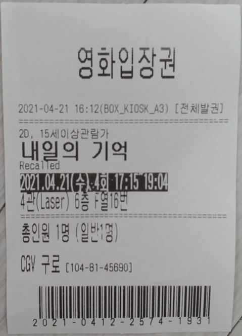 내일의 기억은 나쁜 기억의 트라우마로 기억 상실로 겪게 되는 주인공의 이야기를 영화로 보여주고 있다. 서예지 배우를 중심으로 벌어지는 이야기로 그냥 그렇저럭 볼만한 영화인듯 하다. 미스터리 스릴러라고 하기엔 뭔가 좀 애매한 느낌이다. 결과를 알고 나면 미스터리라는 의문이 싹 풀리는 듯한 영화라서 단순하게 고민하지 않고 보면 좋을 것 같은 영화이다. 이 영화를 보고 난 후 필름마크를 받으러 매표소에 갔다.